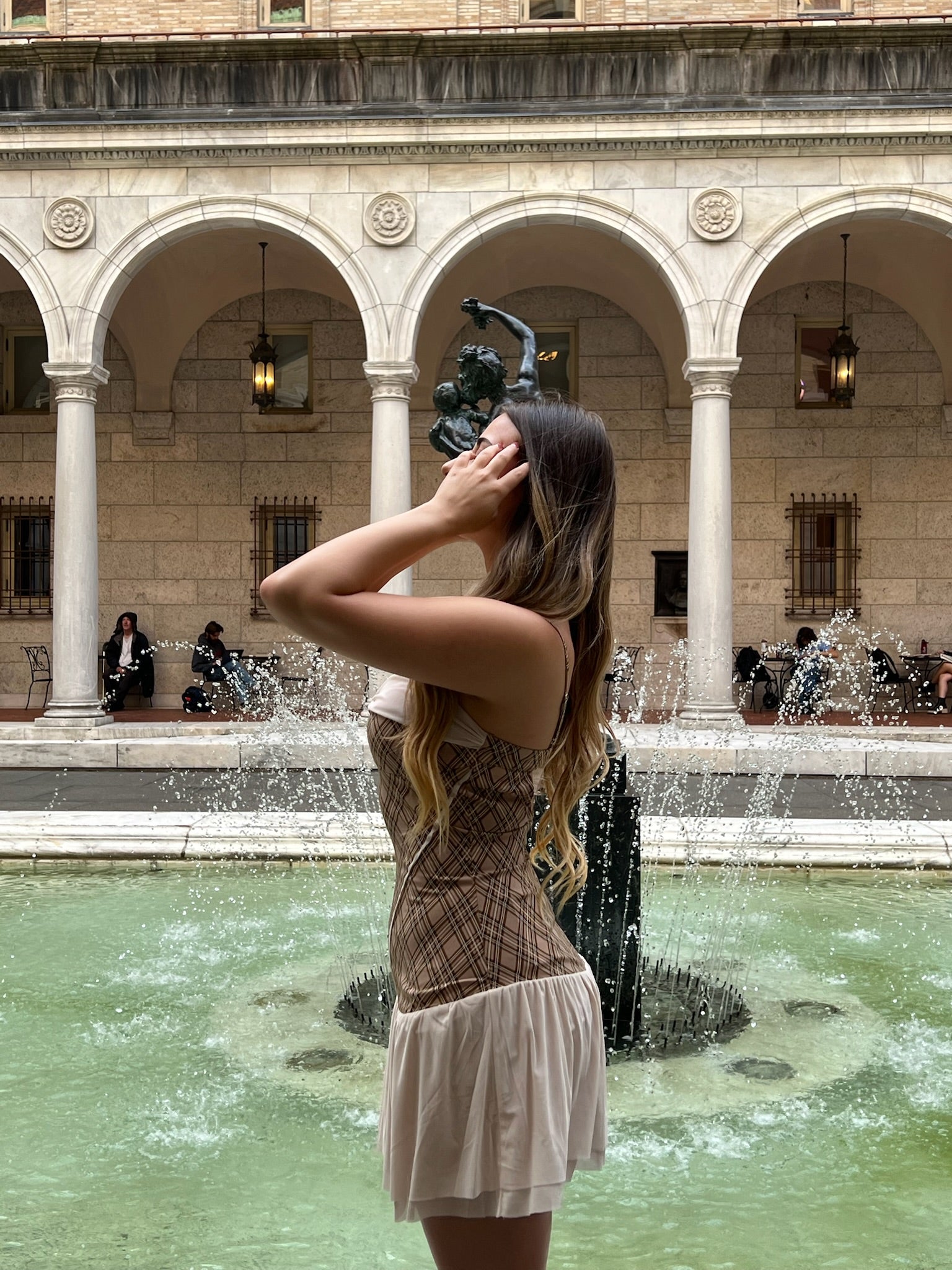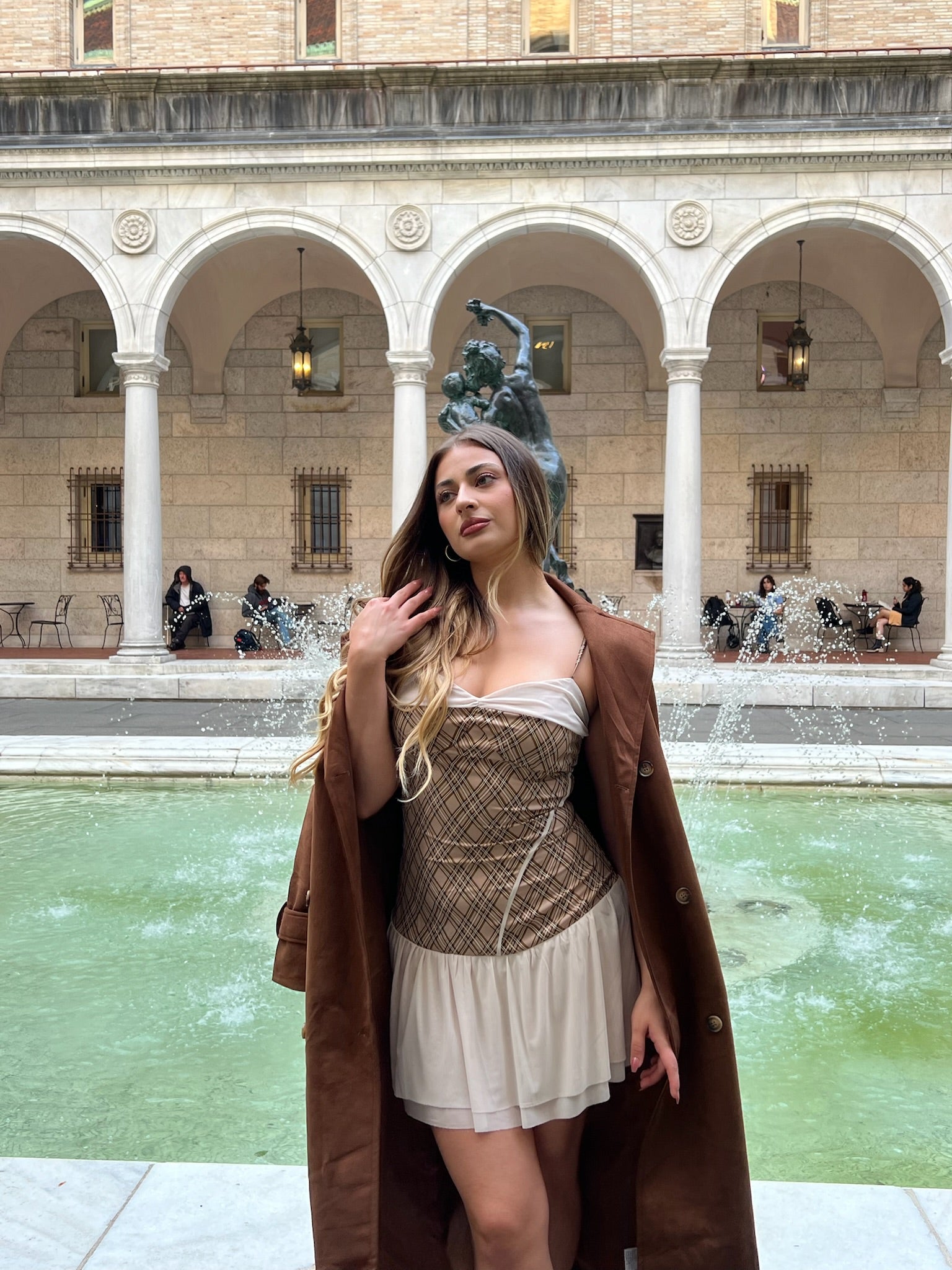 Thin strapped sweetheart neckline with a soft white fold over detail fitted bodice in a beige brown plaid print and a dropped waistline that transitions into flowy
