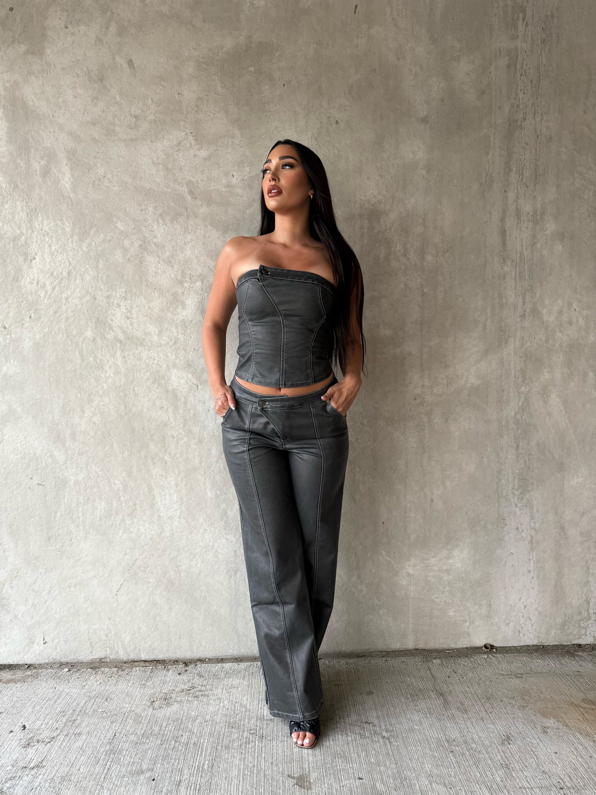 Faux leather gray tube top with white stitching
